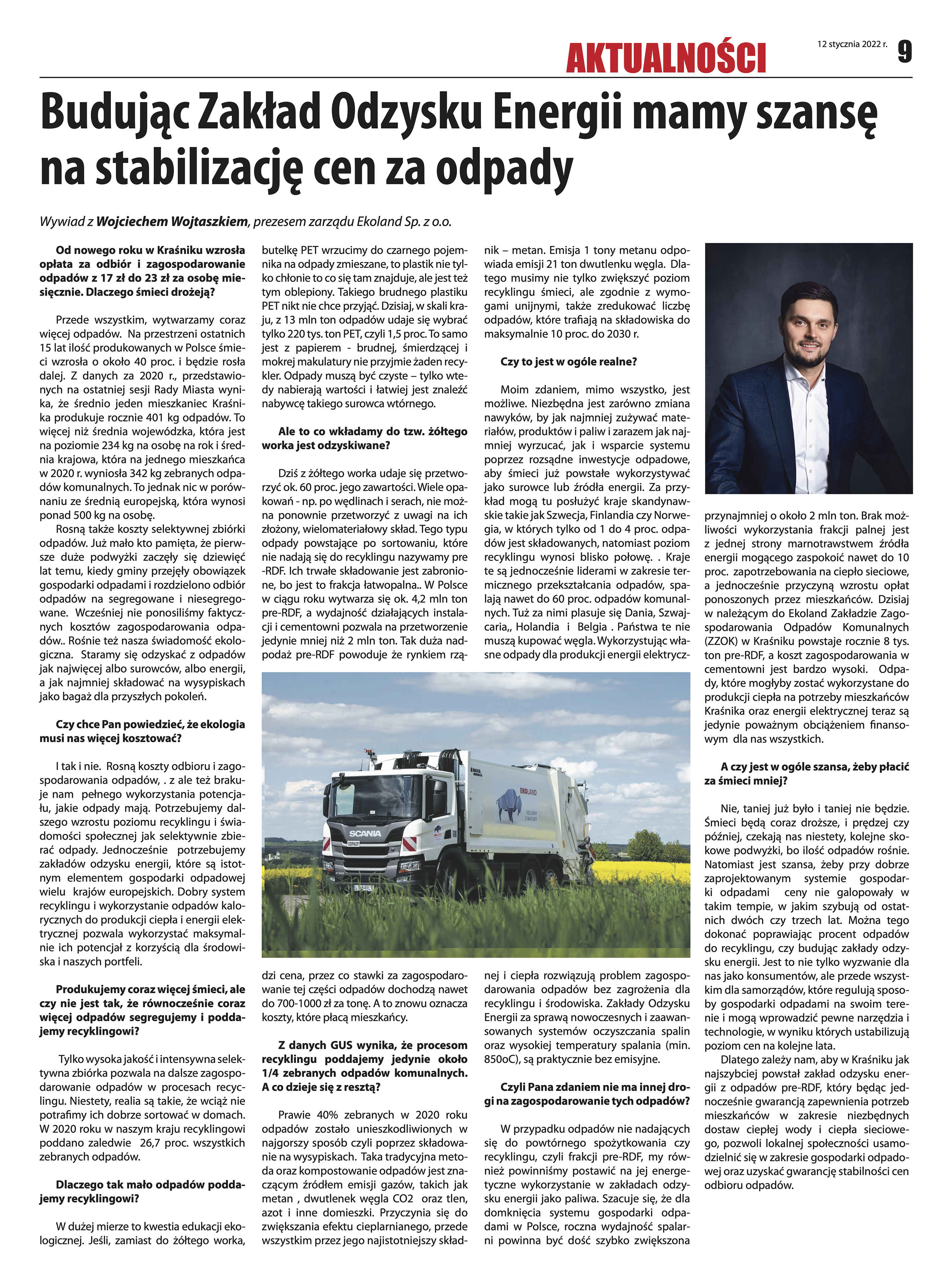 Budując Zakład Odzysku Energii mamy szansę na stabilizację cen za odpady Wywiad z Wojciechem Wojtaszkiem, prezesem zarządu Ekoland Sp. z o.o.