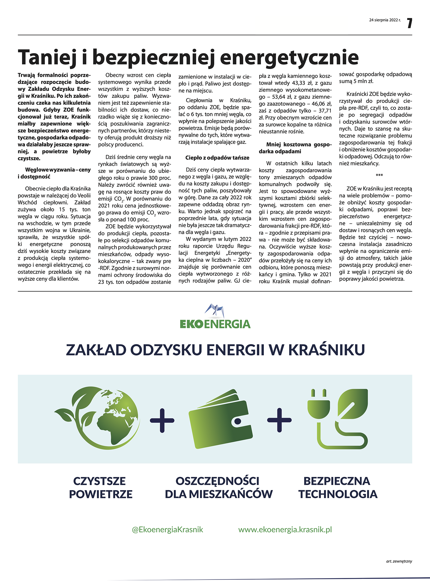 Gdyby ZOE funkcjonował już teraz, Kraśnik miałby zapewnione większe bezpieczeństwo energetyczne, gospodarka odpadowa działałaby jeszcze sprawniej, a powietrze byłoby czystsze.