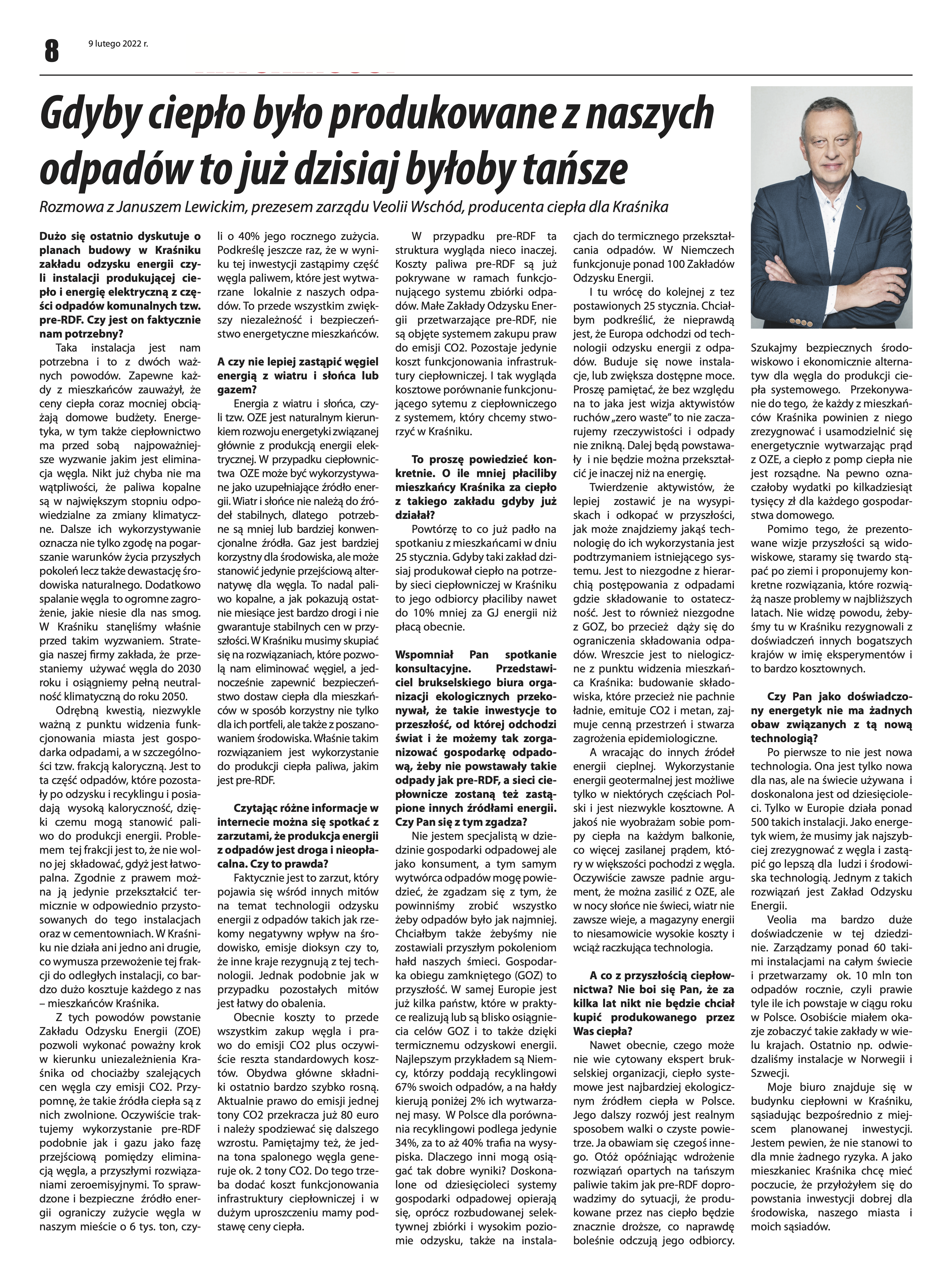 Gdyby ciepło było produkowane z naszych odpadów to już dzisiaj byłoby tańsze. Rozmowa z Januszem Lewickim, prezesem zarządu Veolii Wschód, producenta ciepła dla Kraśnika.