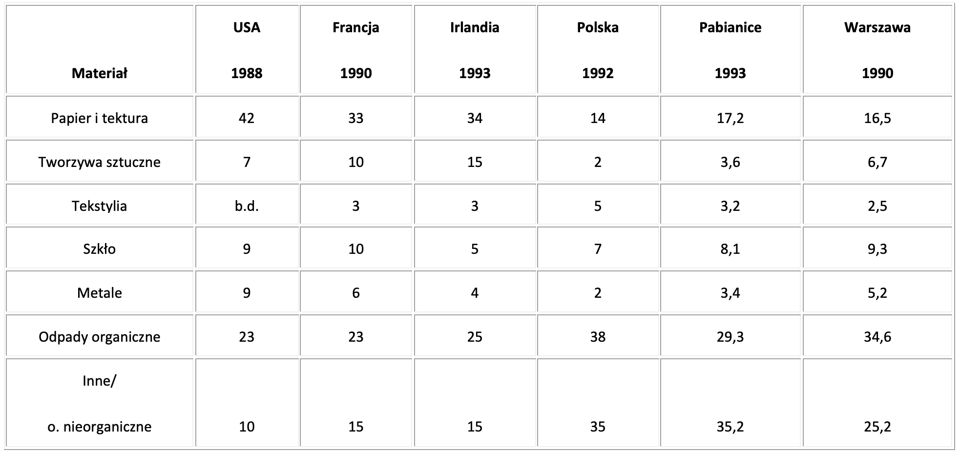 Tabela 1. Skład procentowy odpadów komunalnych w państwach zachodnich.