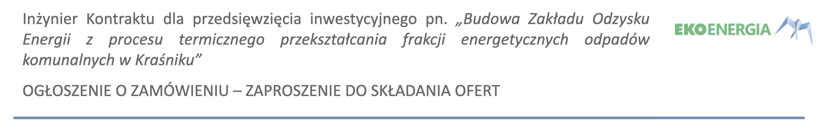 EKO ENERGIA KRAŚNIK Sp. z o.o. z siedzibą w Kraśniku, ul. Piłsudskiego 14, 23-200 Kraśnik wpisana do Krajowego Rejestru Sądowego prowadzonego przez Sąd Rejonowy Lublin Wschód w Lublinie, Wydział Krajowego Rejestru Sądowego, pod numerem KRS 0000480104, Kapitał Zakładowy: 1 500 000,00 zł, NIP: 7123281402, REGON: 061608323 niniejszym zaprasza do udziału w postępowaniu przetargowym i złożenia ofert na świadczenie usług Inżyniera Kontraktu dla przedsięwzięcia inwestycyjnego pn. „Budowa Zakładu Odzysku Energii z procesu termicznego przekształcania frakcji energetycznych odpadów komunalnych w Kraśniku”